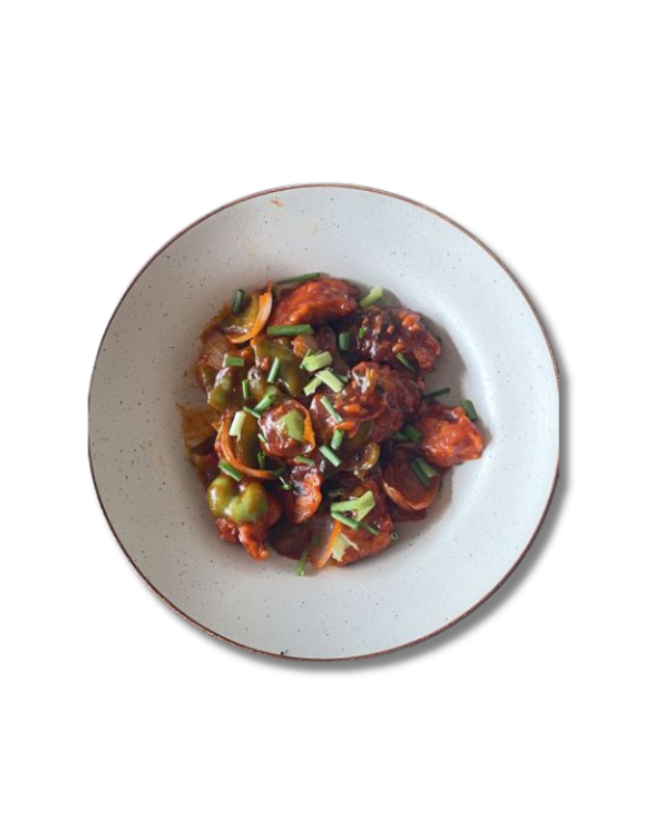 Indo-Chinese classic: tender, bone-in chicken pieces marinated and tossed in a fiery and tangy sauce with sautéed onions, bell peppers, and green chillies